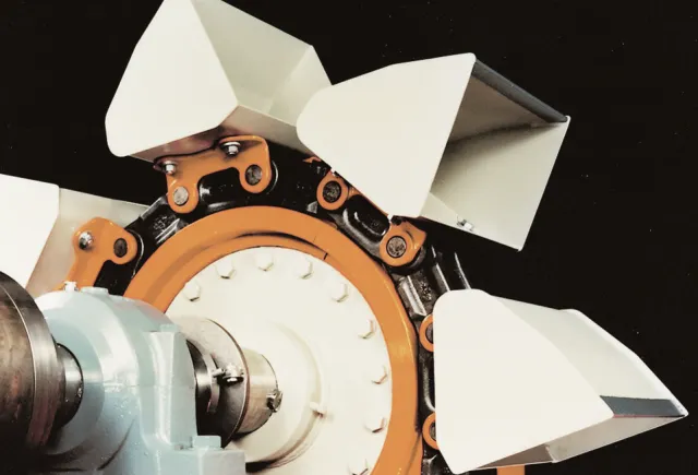 Сыпучий материал поступает в бункер и вертикально поднимается пластинчатой цепью наверх, где он автоматически выгружается под действием силы тяжести. Эта система обеспечивает плавный, эффективный и контролируемый поток материалов.