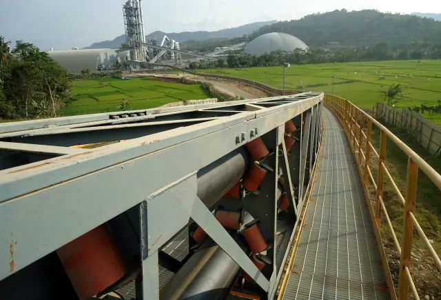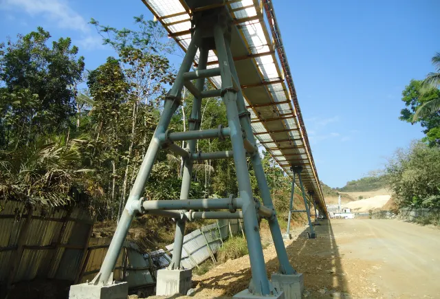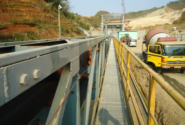 Конвейерная лента имеет форму трубы, создавая полностью закрытую систему. Такая конструкция помогает удерживать пыль, защищать окружающую среду и безопасно транспортировать материалы, снижая воздействие на окружающую среду по всему маршруту.