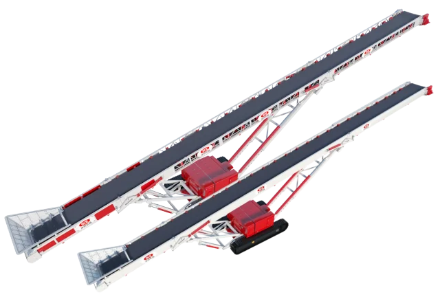 Гусеничные штабелирующие конвейеры серии KTB в основном используются в мобильных дробильно-сортировочных установках для переработки щебня и руды. Производительность штабелирования достигает 1500 т/ч. Размер исходного материала — до 300 мм. Длина конвейера составляет от 20 до 31 м.